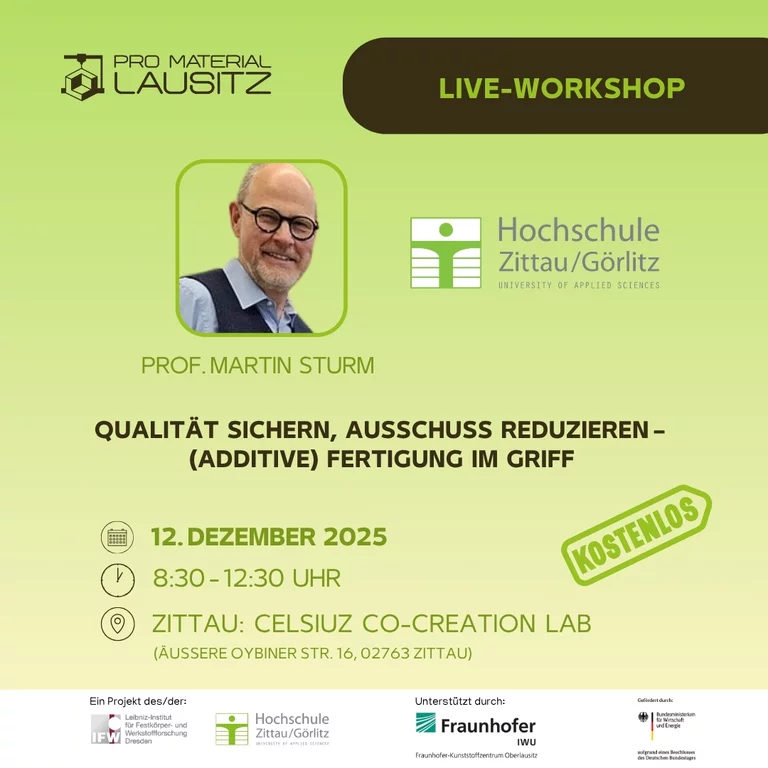 Am 14.4.25 erarbeiten Jakob Hildebrandt (Professor für betrieblichen Umweltschutz und Nachhaltigkeit) und Nikhil Maniyanthotil von der Hochschule Zittau/Görlitz gemeinsam mit Ihnen das Thema „Nachhaltigkeit von 3D-Druck-Produkten: Ressourcen- und Energieeffizienz von AM-Technologien“.